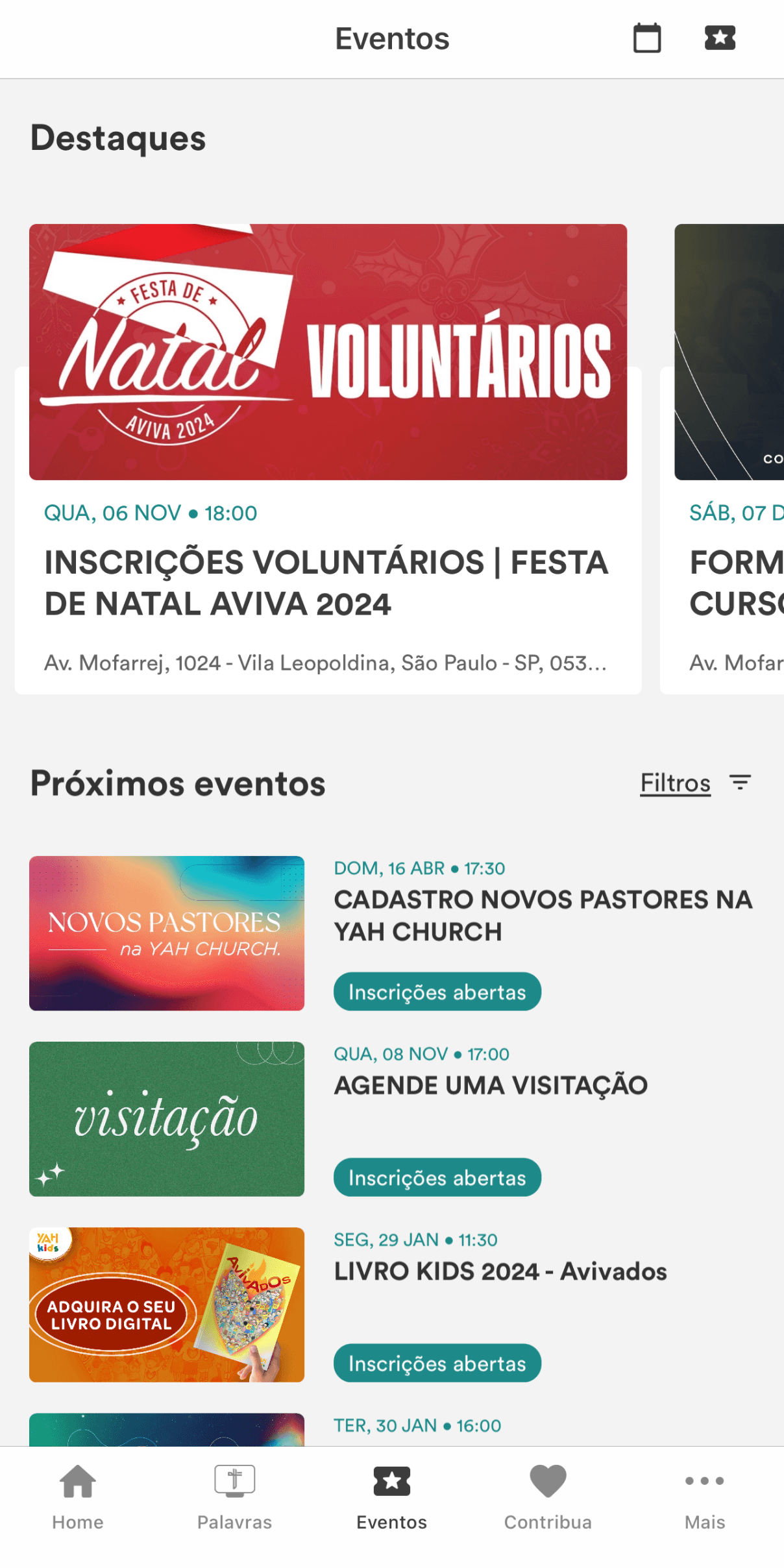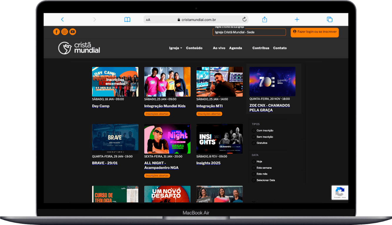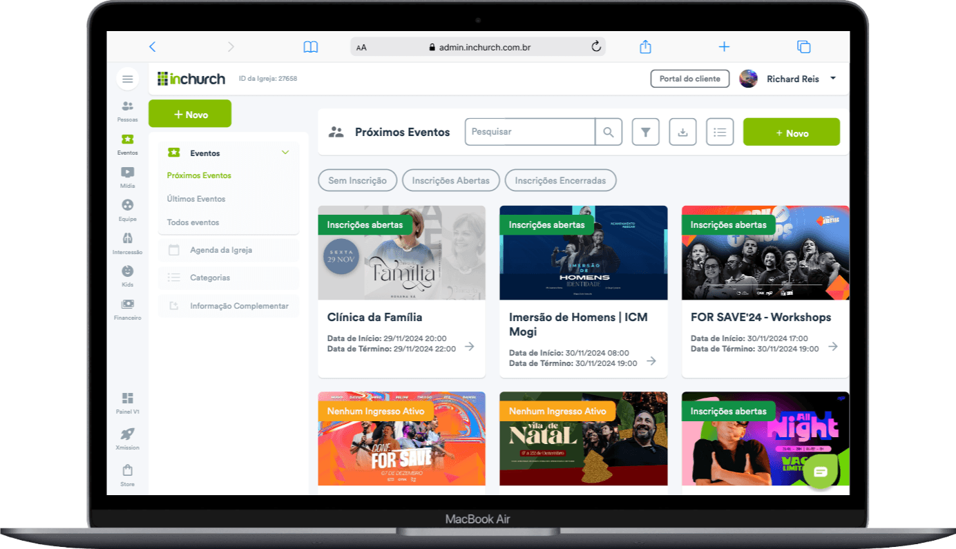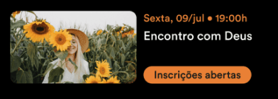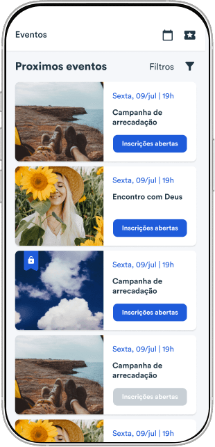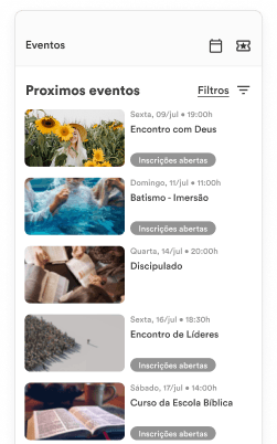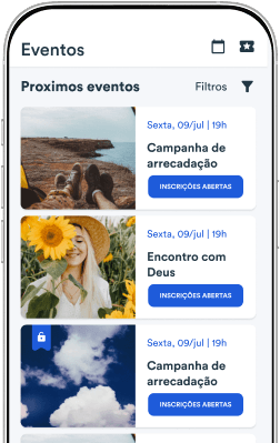 Planeje, gerencie, aumente a participação nos eventos da sua igreja, reúna os membros com mais facilidade e tenha engajamento nos eventos do seu ministério.