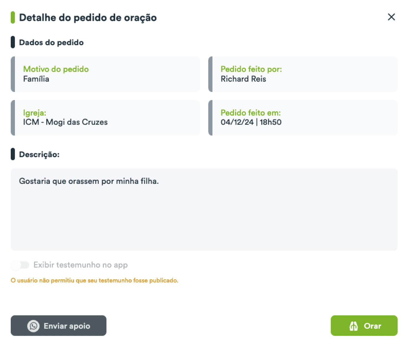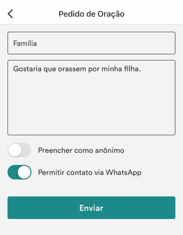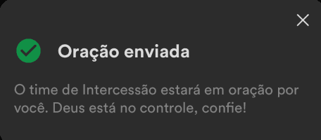 Com essa funcionalidade, os pais e responsáveis podem pedir uma oração sobre seus pequeninos em apenas alguns cliques. Ao fazer uma solicitação via aplicativo, eles recebem uma notificação no momento que a equipe de intercessão começar a orar pela criança.