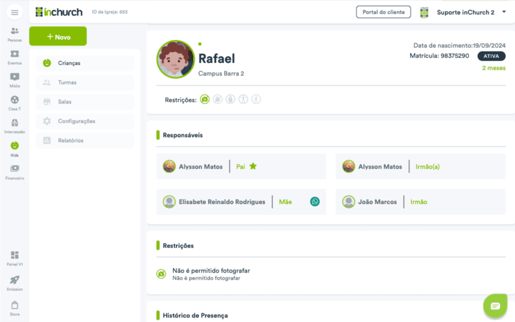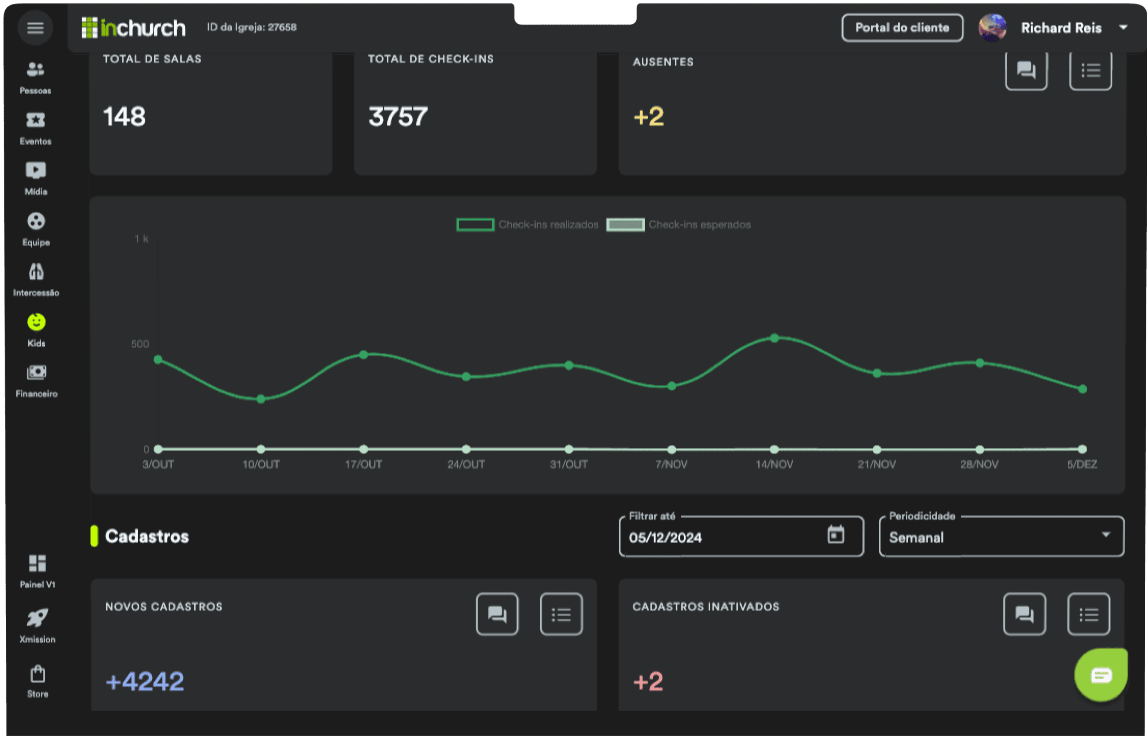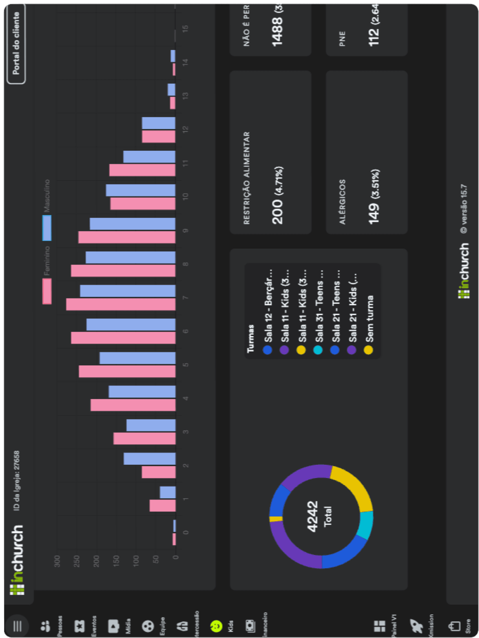 Cadastro de crianças, gestão de turmas, controle de salas, dados estratégicos, configuração de impressoras e integração completa com a plataforma inChurch