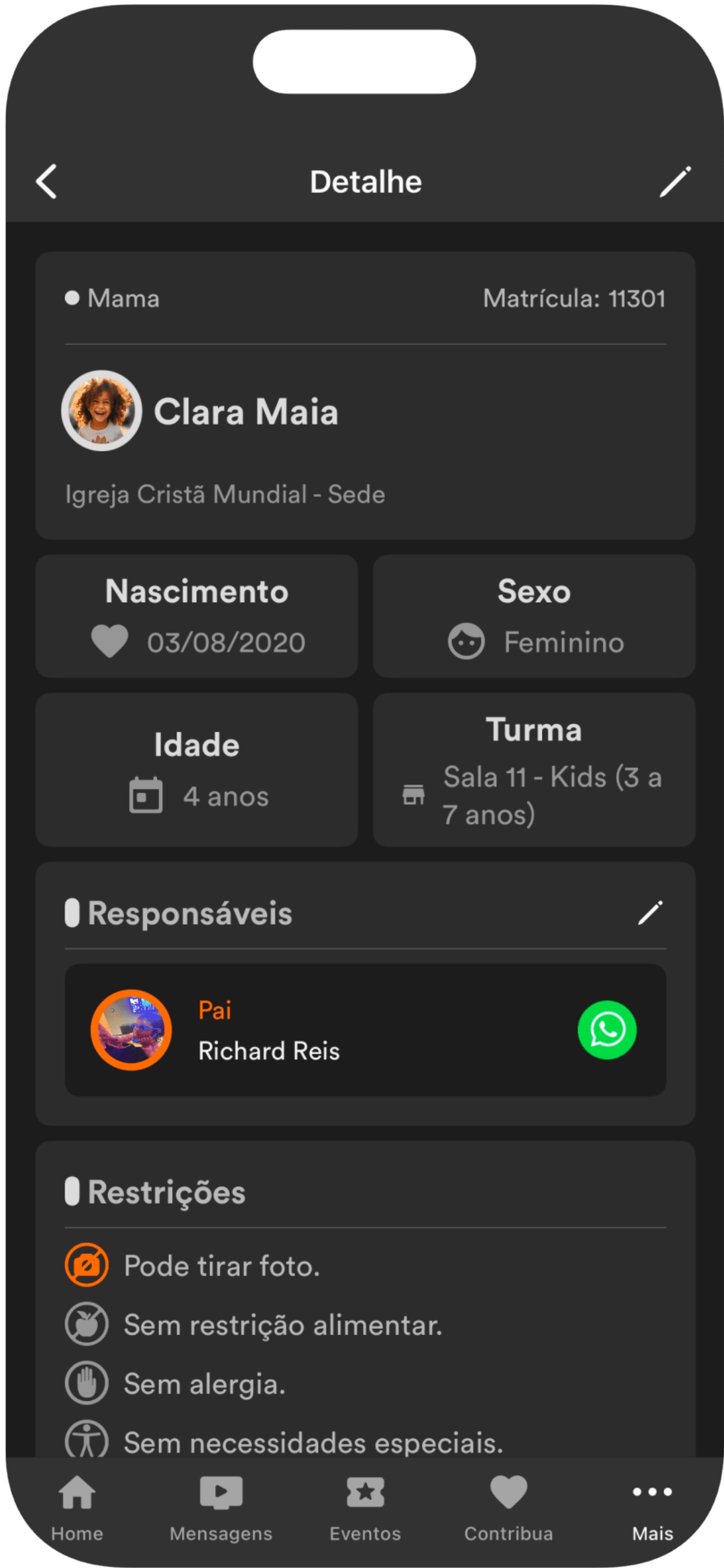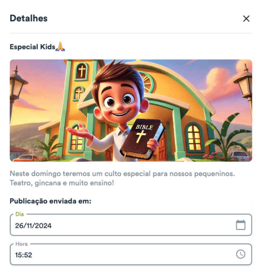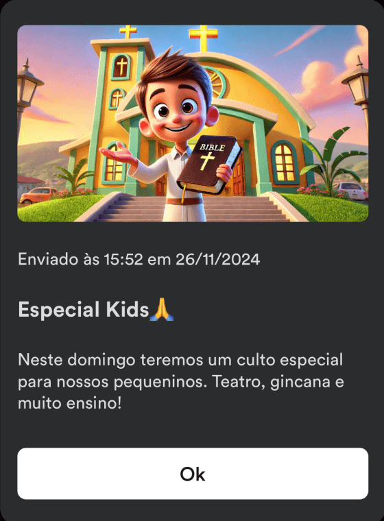 Envie notificações push para cada família, e exiba banners personalizados para os pais, facilitando assim, a comunicação entre os líderes do ministério infantil e os responsáveis, tornando muito mais fácil parabenizar aniversariantes, dar avisos e manter as famílias por dentro das novidades e programações.