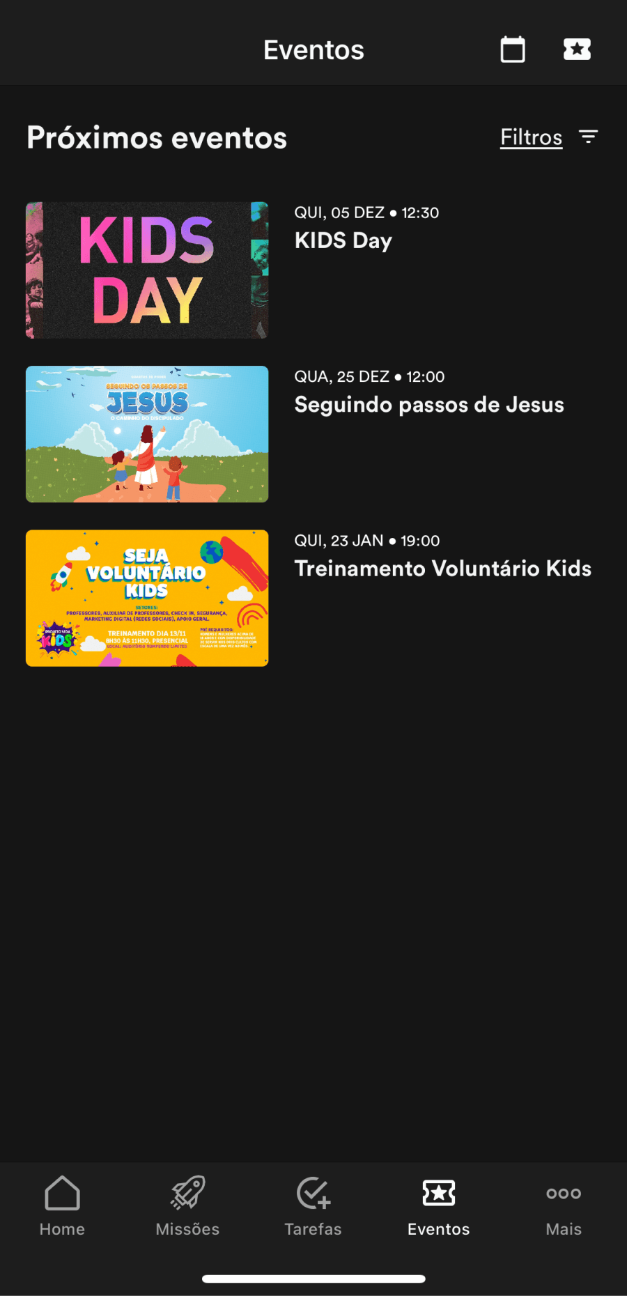 Publique e promova os eventos do ministério infantil na agenda da igreja. Os pais e responsáveis receberão as informações que realmente importam, podendo inscrever seus pequeninos, adquirir ingressos sem deixar a plataforma, e ainda receberem conteúdos exclusivos de acordo com os eventos que seus filhos participarem.