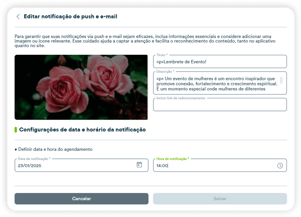 Agora o perfil do administrador tem total liberdade para pausar notificações automáticas recorrentes no app. Isso significa que, se em determinado momento quiser interromper comunicações periódicas, basta pausar, sem precisar excluir a configuração. Isso traz muito mais controle e flexibilidade para sua comunicação.