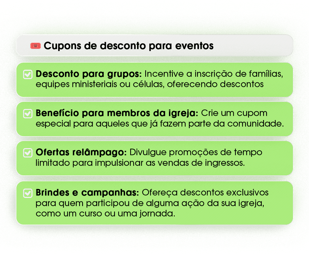 Que tal aumentar as inscrições dos seus eventos com cupons de desconto? Agora, isso é possível diretamente dentro da plataforma da inChurch!