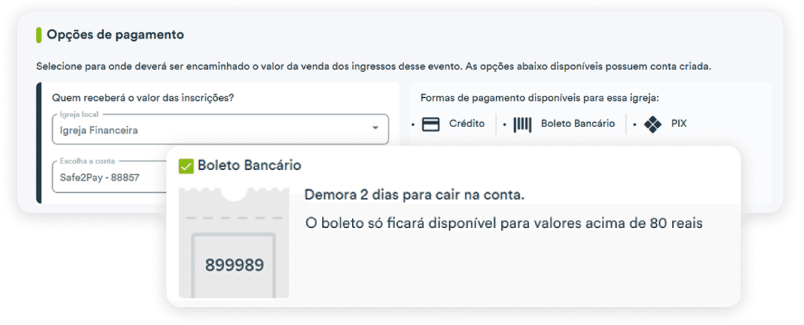Mais segurança e clareza nos processos de pagamento. Agora, em eventos, quando o valor total da compra for inferior a R$80, a opção de pagamento por boleto será automaticamente desabilitada. Já em doações, o sistema também passou a respeitar o valor mínimo de R$10 para essa forma de pagamento.