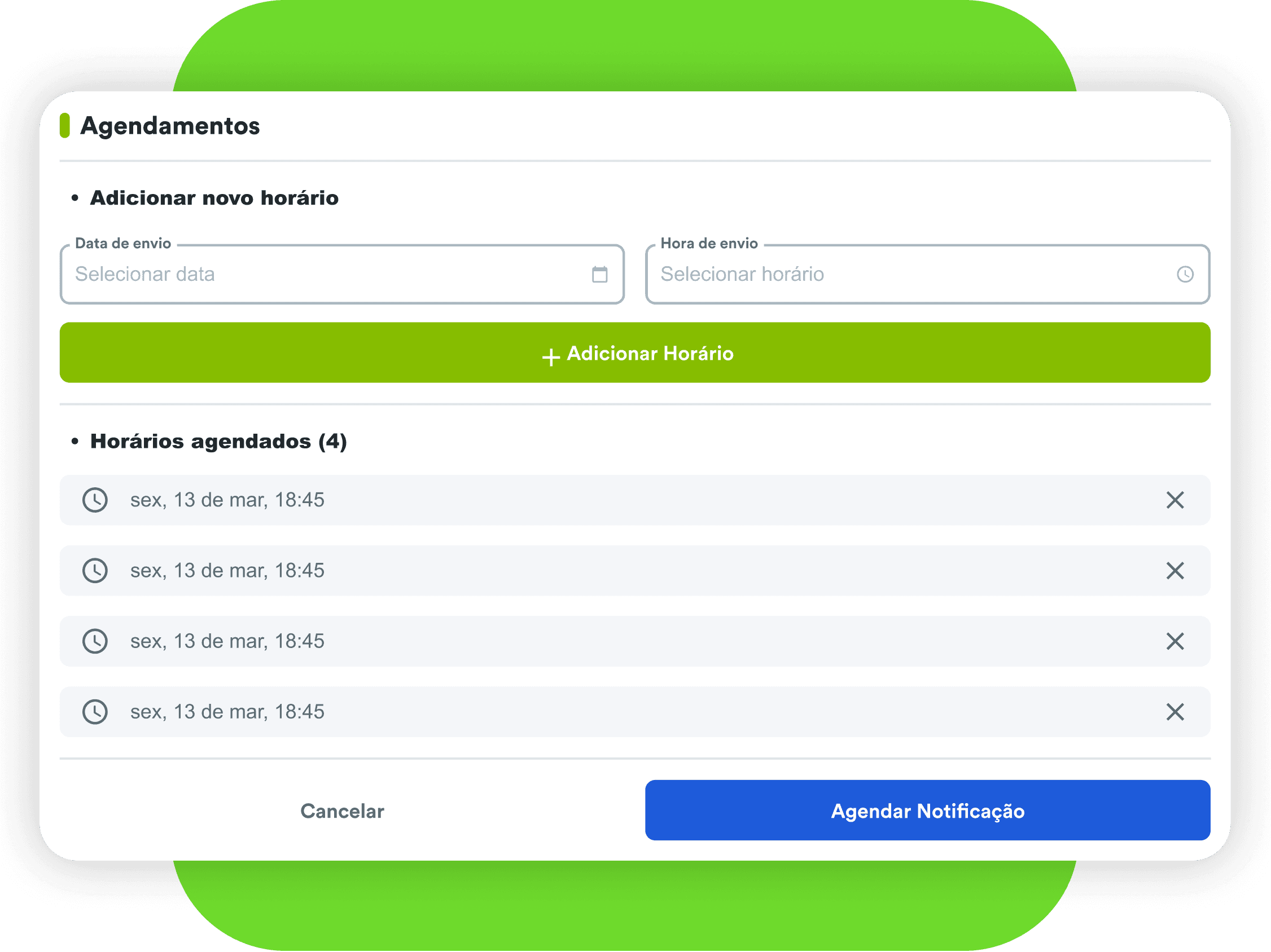 Agora, você configura uma única notificação e define múltiplos horários de envio — com a opção de adicionar ou remover agendamentos individualmente. Na listagem, é possível acompanhar quantos disparos ainda estão na fila e qual é o próximo horário programado.