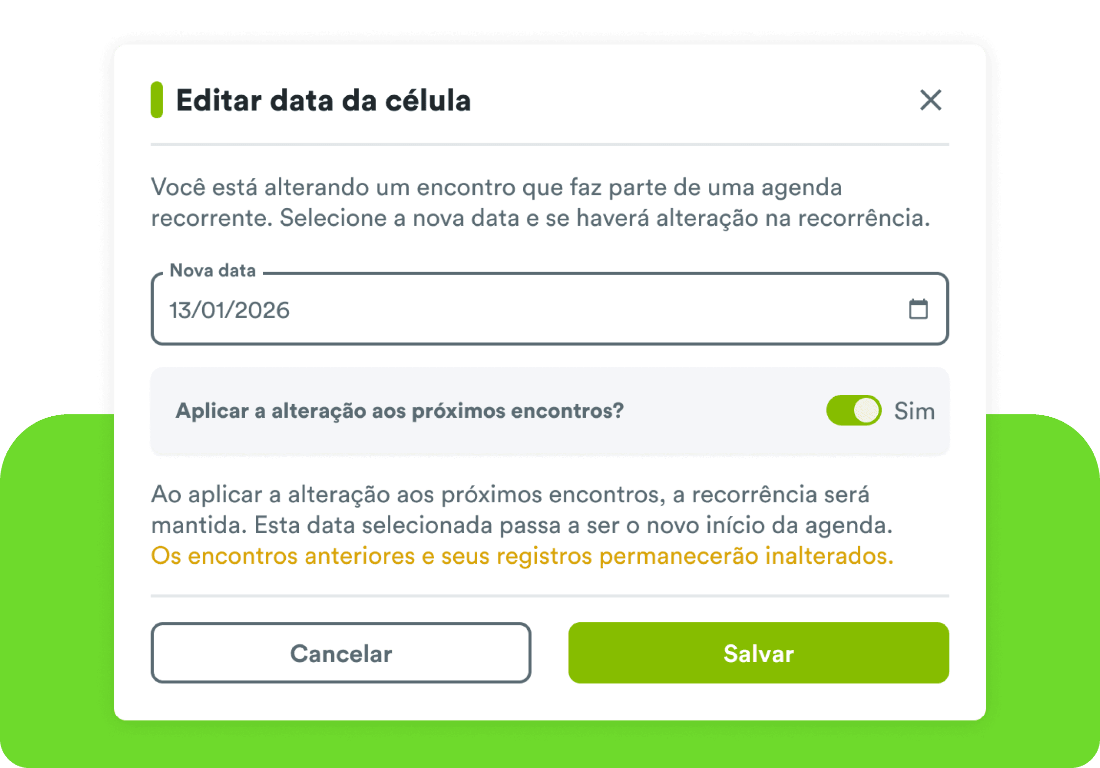 Quando uma célula quinzenal ou semanal precisa ser adiada por um imprevisto, o sistema agora oferece a opção de ajustar automaticamente os encontros futuros da recorrência — sem a necessidade de alterações manuais uma a uma.