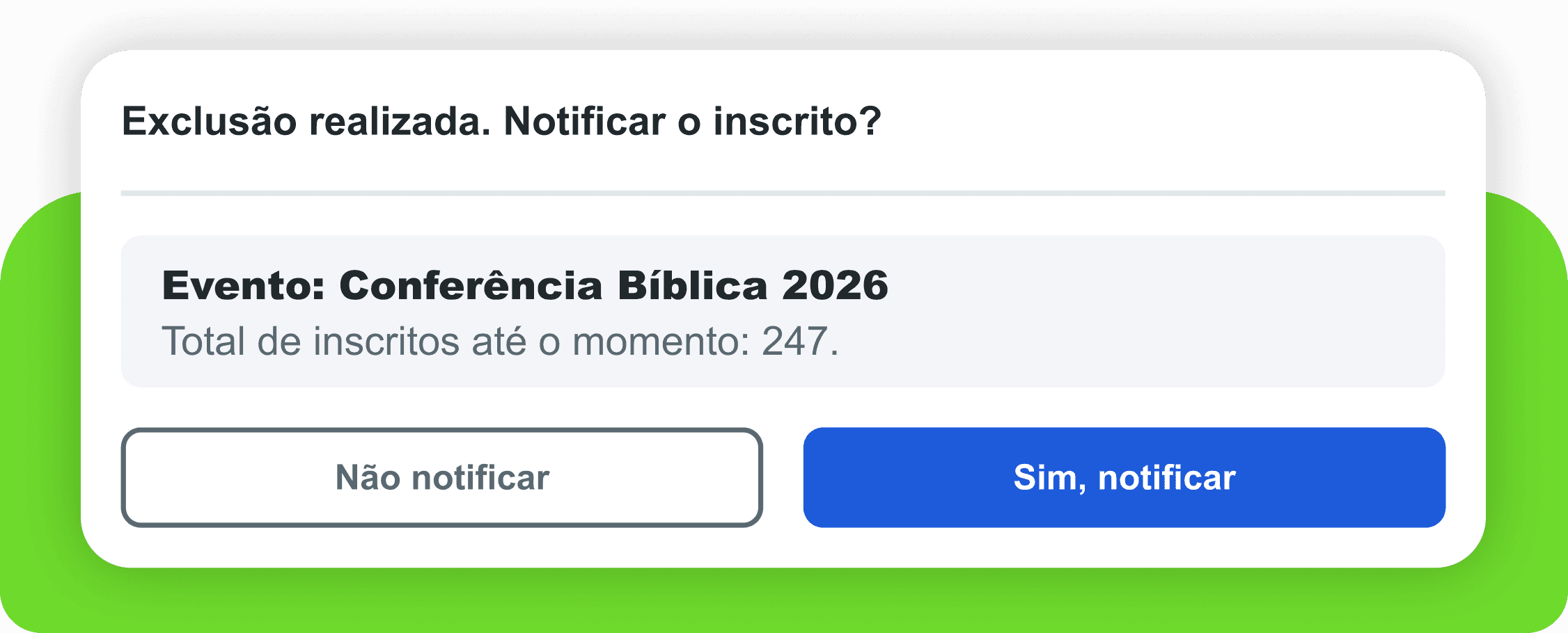 Nem toda exclusão de inscrição precisa gerar uma comunicação ao participante. Agora, ao excluir uma inscrição no painel, um modal exibe a pergunta: notificar ou não o inscrito?