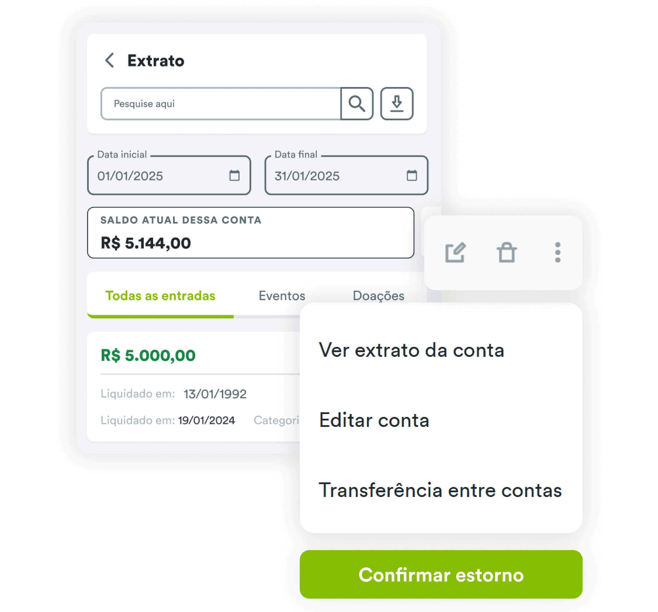 Nota: O estorno, nesta primeira fase, é sempre total. A transação permanece registrada no extrato com o status "Estornada" — mas seu valor deixa de ser contabilizado no saldo e nos relatórios financeiro