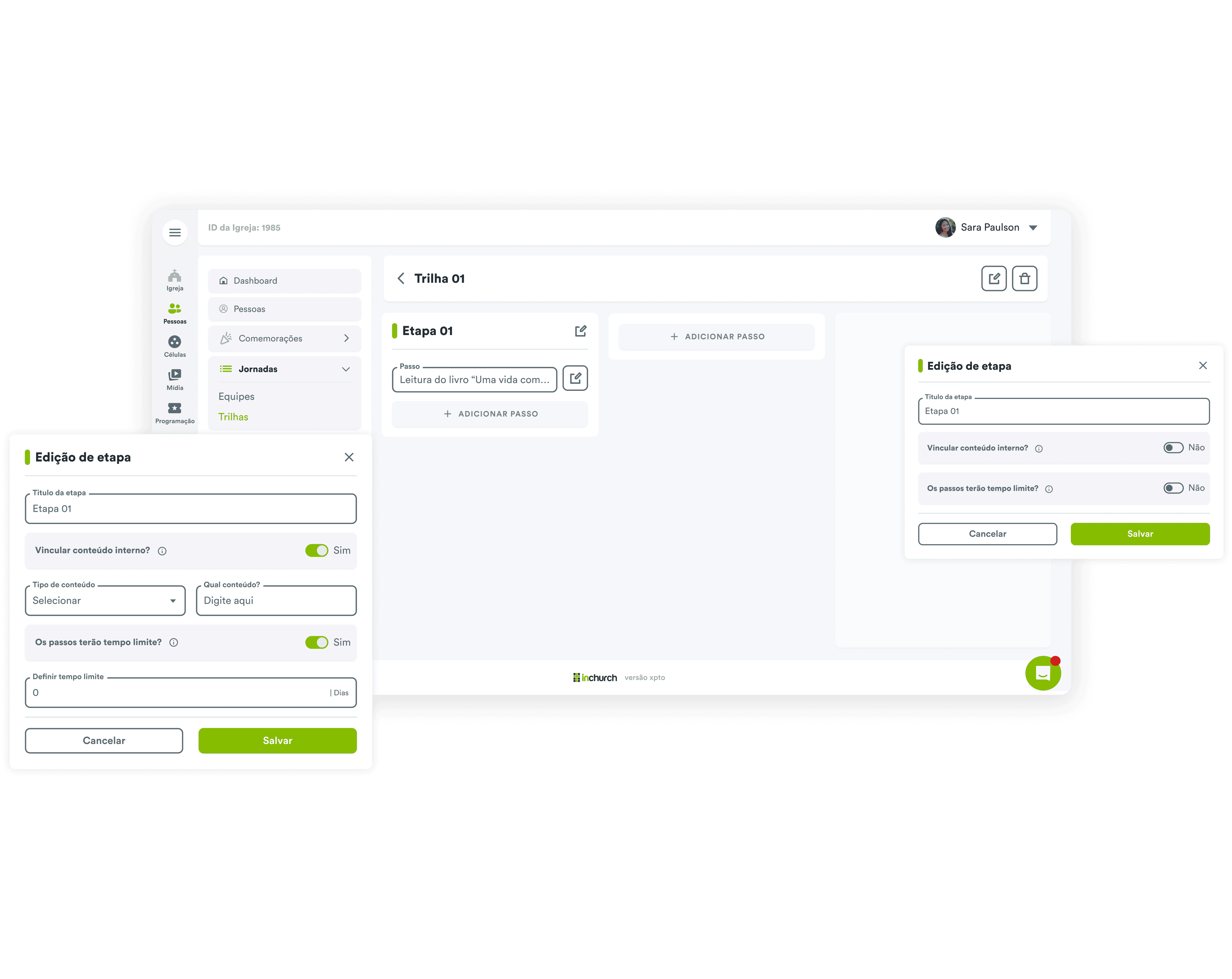 Essa funcionalidade foi pensada para que cada Igreja tenha maior autonomia e controle sobre as suas Jornadas, podendo adaptar cada etapa conforme o momento da comunidade. Dessa forma, as experiências dentro da plataforma se tornam mais dinâmicas, relevantes e eficazes, contribuindo para que os membros vivam jornadas ainda mais significativas e bem-sucedidas.