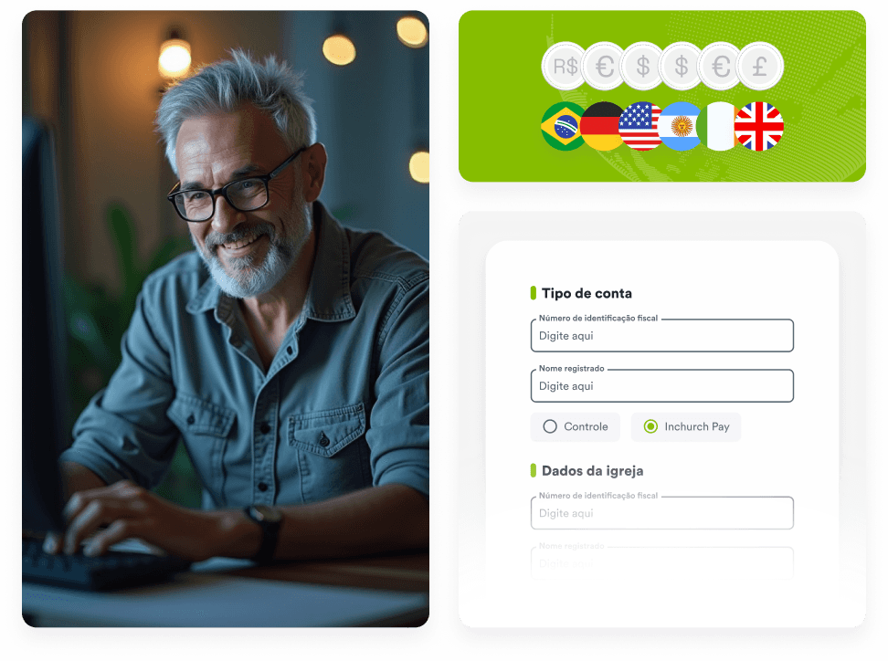 Para igrejas que utilizam moedas internacionais, o sistema permite, de forma opcional a criação de uma conta de processamento via Stripe, facilitando transações internacionais com segurança e praticidade.