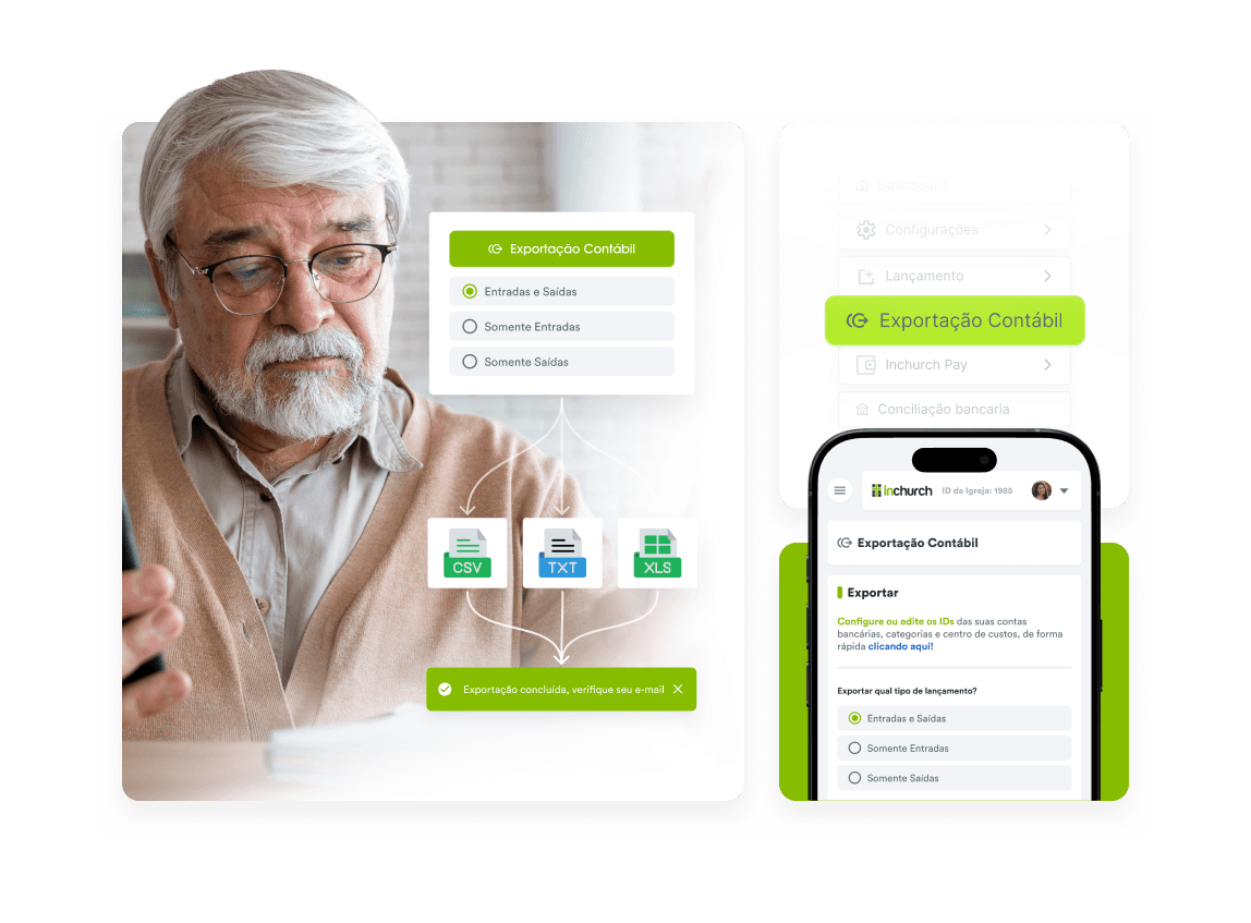 Tudo acontece dentro do módulo financeiro, com uma experiência prática e intuitiva que facilita o envio de informações para contadores externos e para qualquer sistema contábil. Essa novidade traz agilidade ao processo, reduz erros e elimina retrabalhos manuais, garantindo que o financeiro da igreja esteja sempre alinhado e pronto para auditorias e fechamentos.