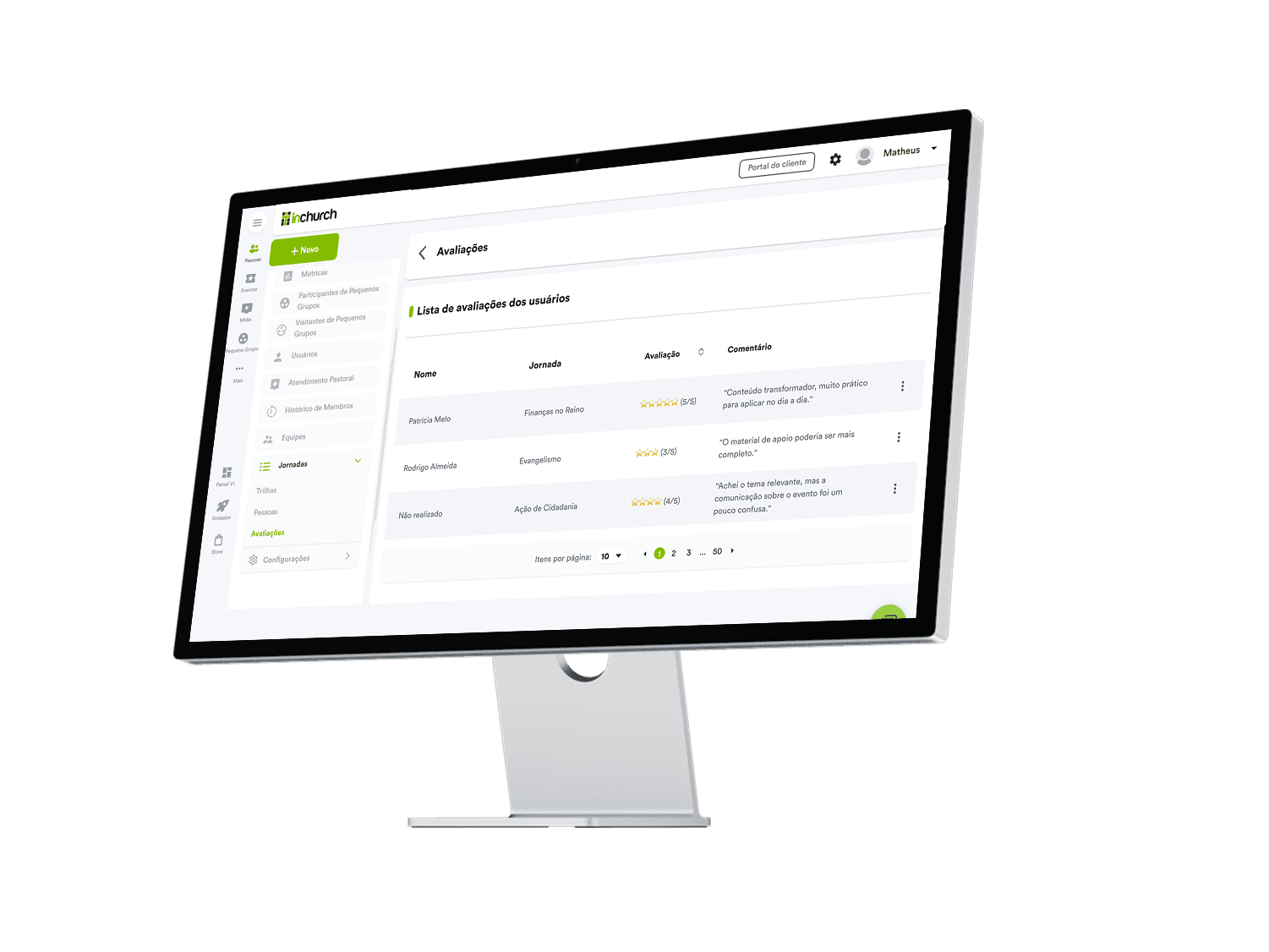 Os seus membros conseguem agora avaliar as jornadas e isso faz você entender quais trilhas estão se destacando, quais precisam de mais atenção e também de entender o que os membros da sua Igreja pensam sobre cada jornada criada.